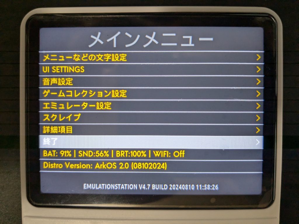 数日後、遅延もなく普通に届いたので早速ARKOSをダウンロードしてSDから起動しようとしてみたが起動しない。R36Sはリビジョンによってディスプレイパネルが4種類あり、搭載パネルにファイルを合わせないとならないらしく、全てのパターンで試してみてもやはり起動しない。付属のマイクロSDからは起動するが、どうもこれはARKOSではないようである(ARKOS 2.0のクレジットは出ていたがフェイク)。