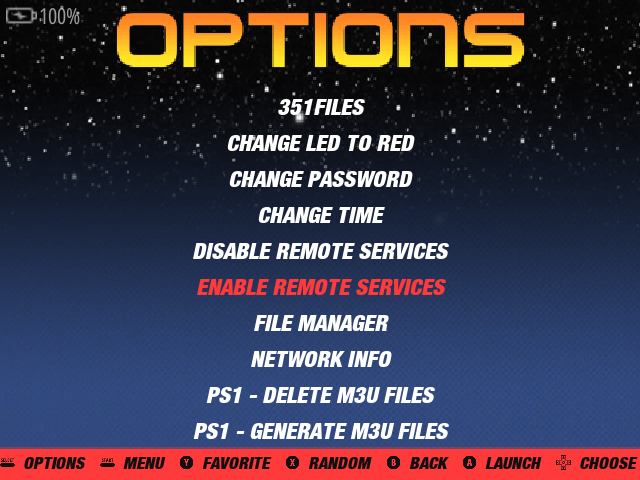 R36S側から、Options > Enable Remote Services を選択すると、SMBとSSHが有効になり、ファイルの転送やSSHが行えるようになる。