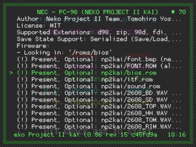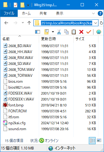 \\roms\bios\ ディレクトリにnp2kai ディレクトリを作成し、BIOSファイルを置く。Linuxは大文字小文字の区別をするのであわせておく。