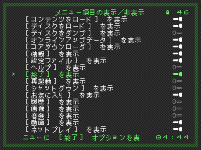 日本語の方が安心感はあるが、英数字も全て全角になり、何故か余白も狭くなる。全ての文字が入らないケースが多くなり、入り切らない文字はカーソルを合わせると左右にスクロールされるので読めない事はないが、慣れたら英語に戻した方が良いかも(デフォルトテーマのrguiの場合)。↑のBIOS画像が違いが解りやすい。 - メニュー項目の表示/非表示
